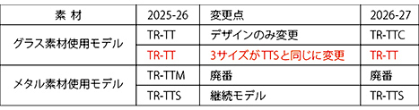 | 2026-27モデルよりTR-TTの3サイズがTR-TTSと同じ3サイズに変更になり、 Technical Ride シリーズのラインナップが下記の通りに変更となります。 NEW TR-TT は乗りやすく、回しやすいスキーで、カービングをより簡単に!を目指し開発したスキーです。TR-TTS のサイドカットをベースに、フレックスバランスを柔らかくし、全体を軽量にすることで、ずらしのターンからカービングへと楽にレベルアップすることを手助けすることの出来るスキーになっています。 12月1日販売開始です。 2025-26 TR-TT 165cm シェイプ 3サイズ:112-66-100mm 数量限定モデル 2026-27 TR-TT 165cm シェイプ 3サイズ:119-66-103mm >詳細はこちらからどうぞ。 |